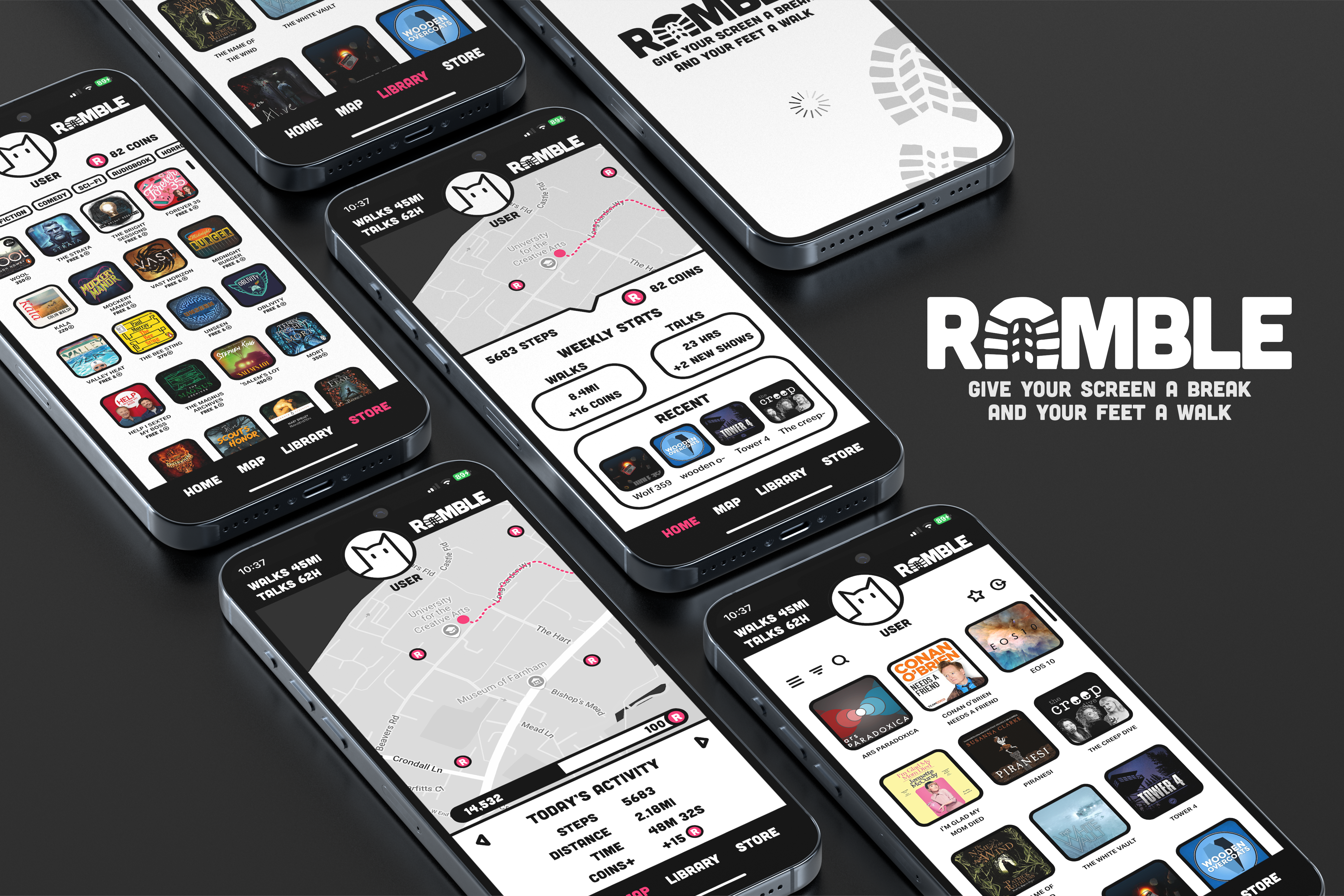 Ramble was a short and fast paced project. I developed an app inspired by Spotify, Pokémon Go and Strava. It’s a service that encourages users to get outside and walk by promoting audio media. Walking is rewarded in coins, these can be spent in the in-app shop where users can buy audio books or unlock early podcast/audio drama episodes.